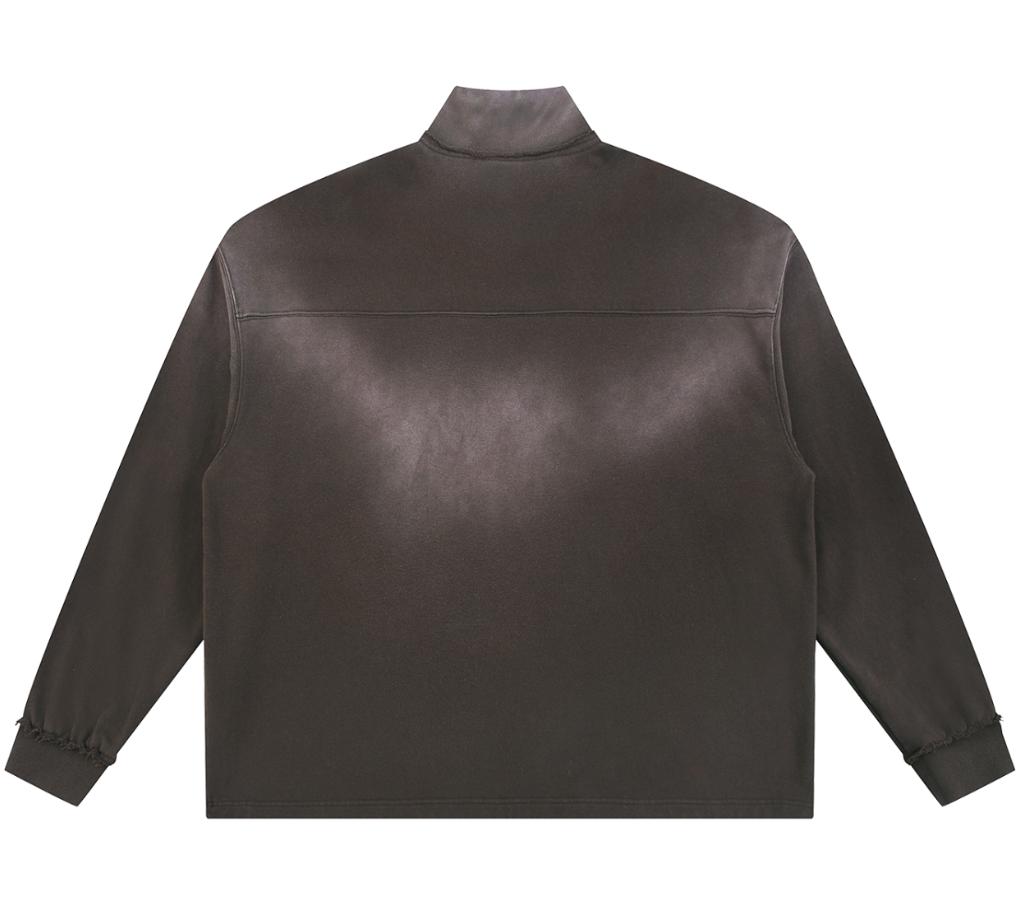 Discover our heavyweight sweatshirt featuring a distinctive sun fade treatment and raw edge details. The stand collar and half-zip design offer a modern urban aesthetic.